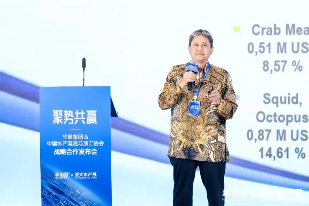 印度尼西亚渔产品流通与加工协会会长Budhi Wibowo以“亚洲水产品国际贸易格局”为切入点,深入分析了东南亚水产市场的巨大潜力与发展机遇。他特别提到,作为东盟最大的经济体,印尼在区域水产贸易中扮演着枢纽角色,并凭借其独特的地理与市场优势,成为连接亚洲与全球水产贸易的重要桥梁。他还强调,印尼市场的发展为中国水产企业“出海”提供了至关重要的战略参考与合作机会,预示着两国在水产领域的深度合作潜力。