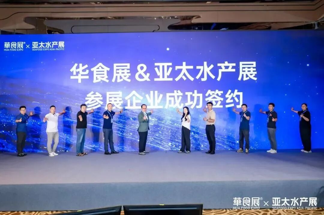 发布会的核心环节——中国水产流通与加工协会与华墨集团的签约仪式,将现场气氛推向高潮。双方正式宣布联合主办2026亚太水产食品展览会(Seafood Expo Asia-Pacific)、2026华食展(HUA FOOD EXPO),标志着两大行业中坚力量将整合各自资源:通过积极运用协会的影响力和行业洞察力、华墨集团的会展运营实力与全球网络,共同打造更具规模、更富实效的水产行业盛会。